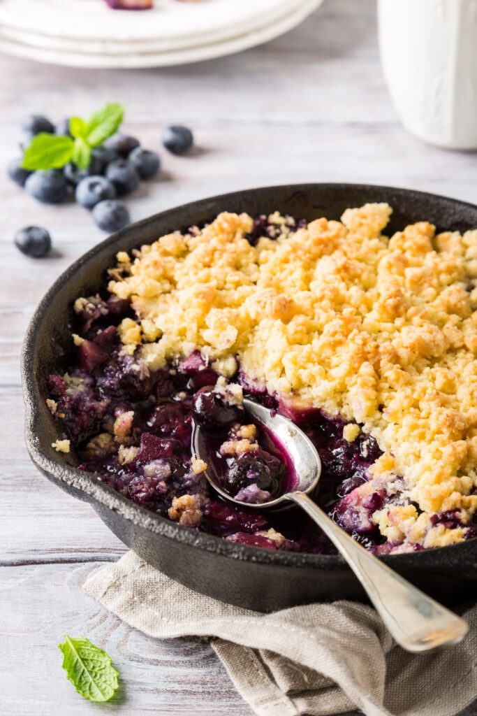 5. Place the baking dish in the preheated oven and bake for approximately 35-40 minutes, or until the cobbler is golden brown and the blueberries are bubbling.