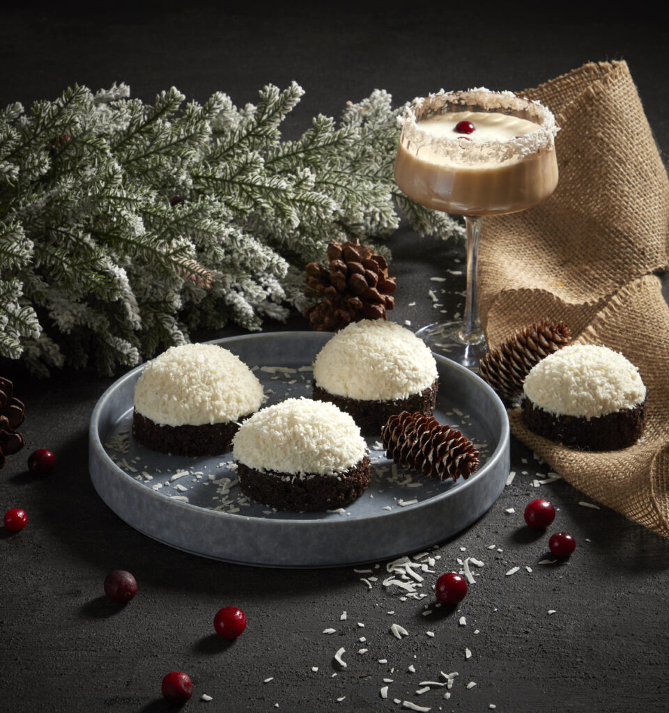 6. Remove the domes from the molds and place them on the brownies cut in circle. Let them thaw for 2 hours at room temperature, then sprinkle grated coconut over the entire dome.