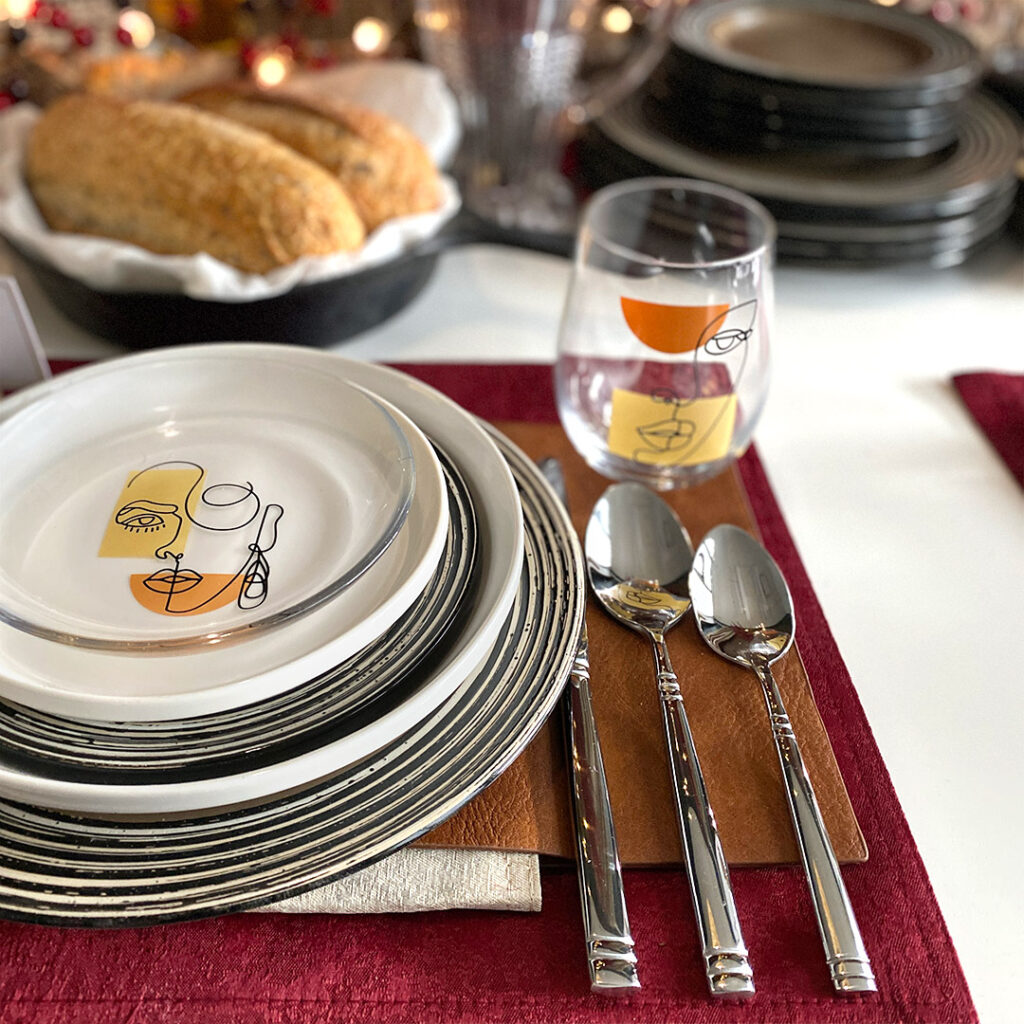 While we’ve opted for an elegant flatware set, we don’t really want to distract from the effect we’re trying to create with the table linens and dinnerware set. Our Tahiti Dinnerware Set comes in multiple colours but here we went with the Mocha set to maintain the brown and red theme across the table. We’ve added our new small Persona plates and drinkware that still have the same colours but its modern and artistic designs are a fun way to add some personality and flair to the table.