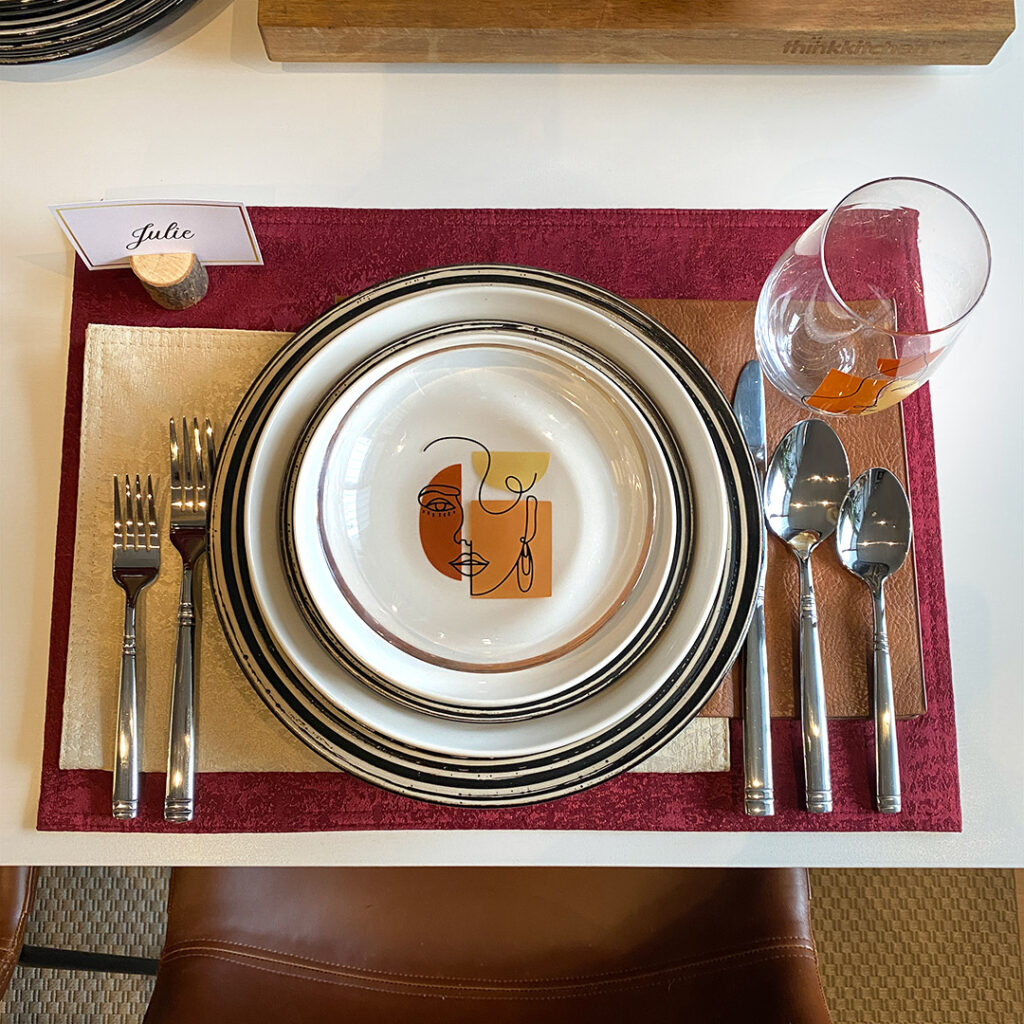 Here, we really rely on table linens and using different colours and textures to set the tone of your table. We’re mixing and matching the Calmante placemats in the beautiful and luxurious Merlot colour, and layering it with the Calmante beige napkins to add a subtle, gold shimmer. Finally, before placing your plate on top, we want to add another placemat – this time our faux leather tan placemat, in a way so just one side is peeking out from the right side of your plate. Playing with textures and deep, earth tones in this way, creates richness and depth on the table.