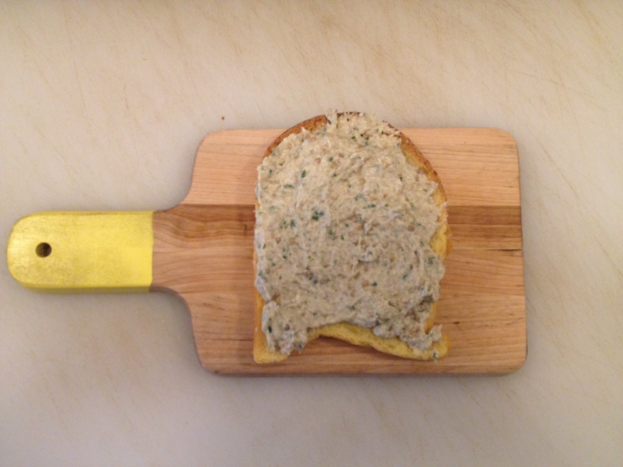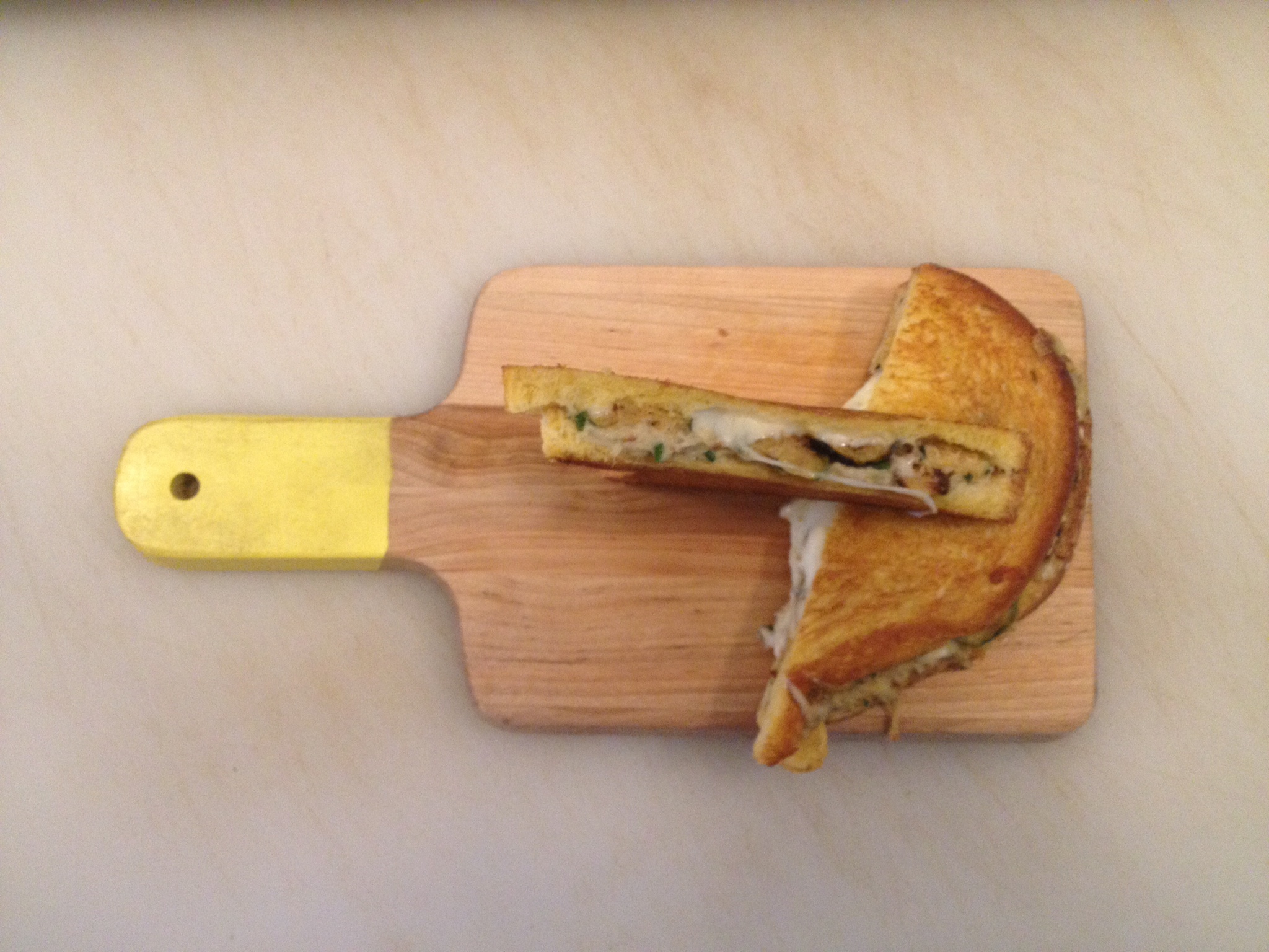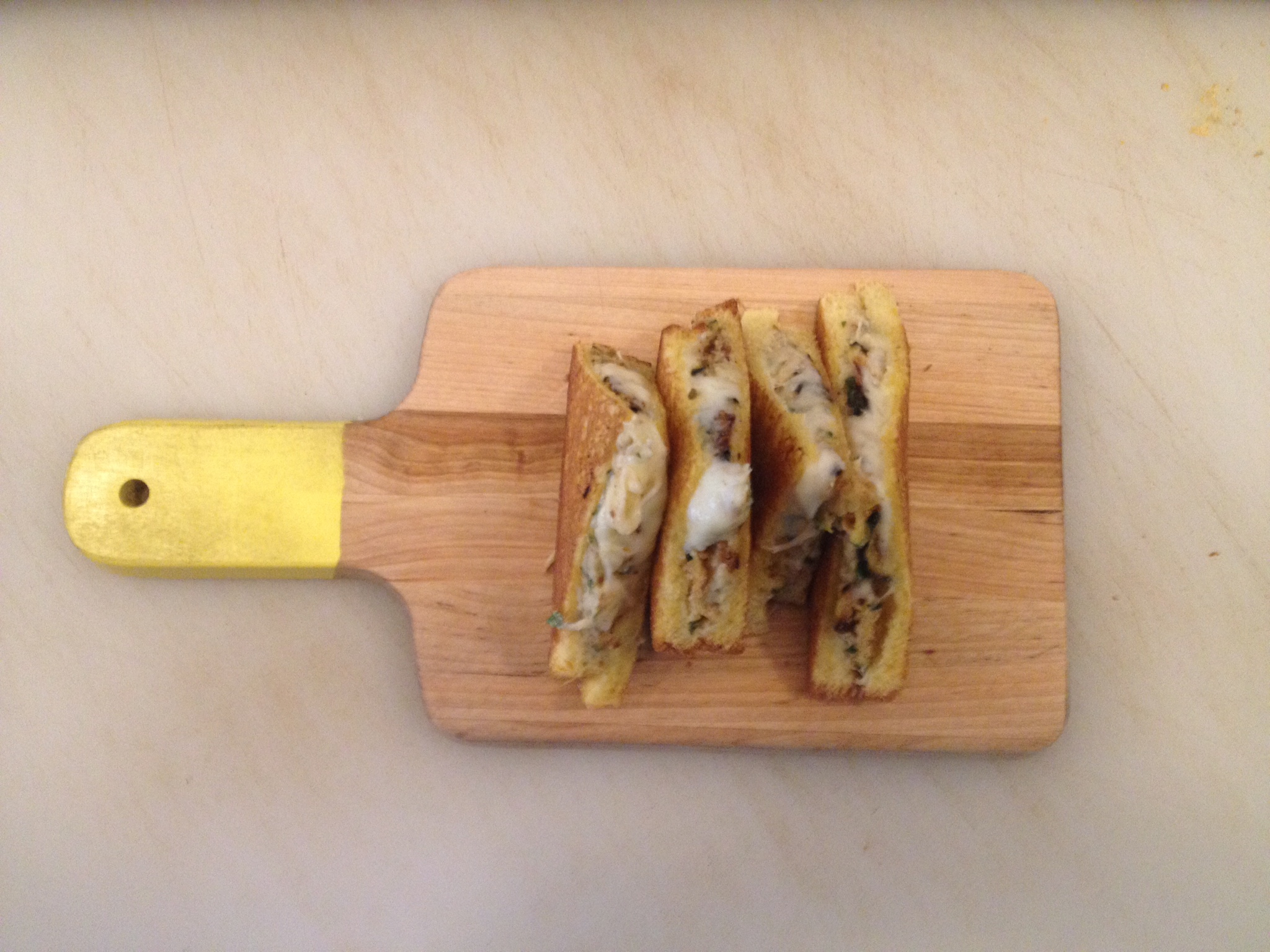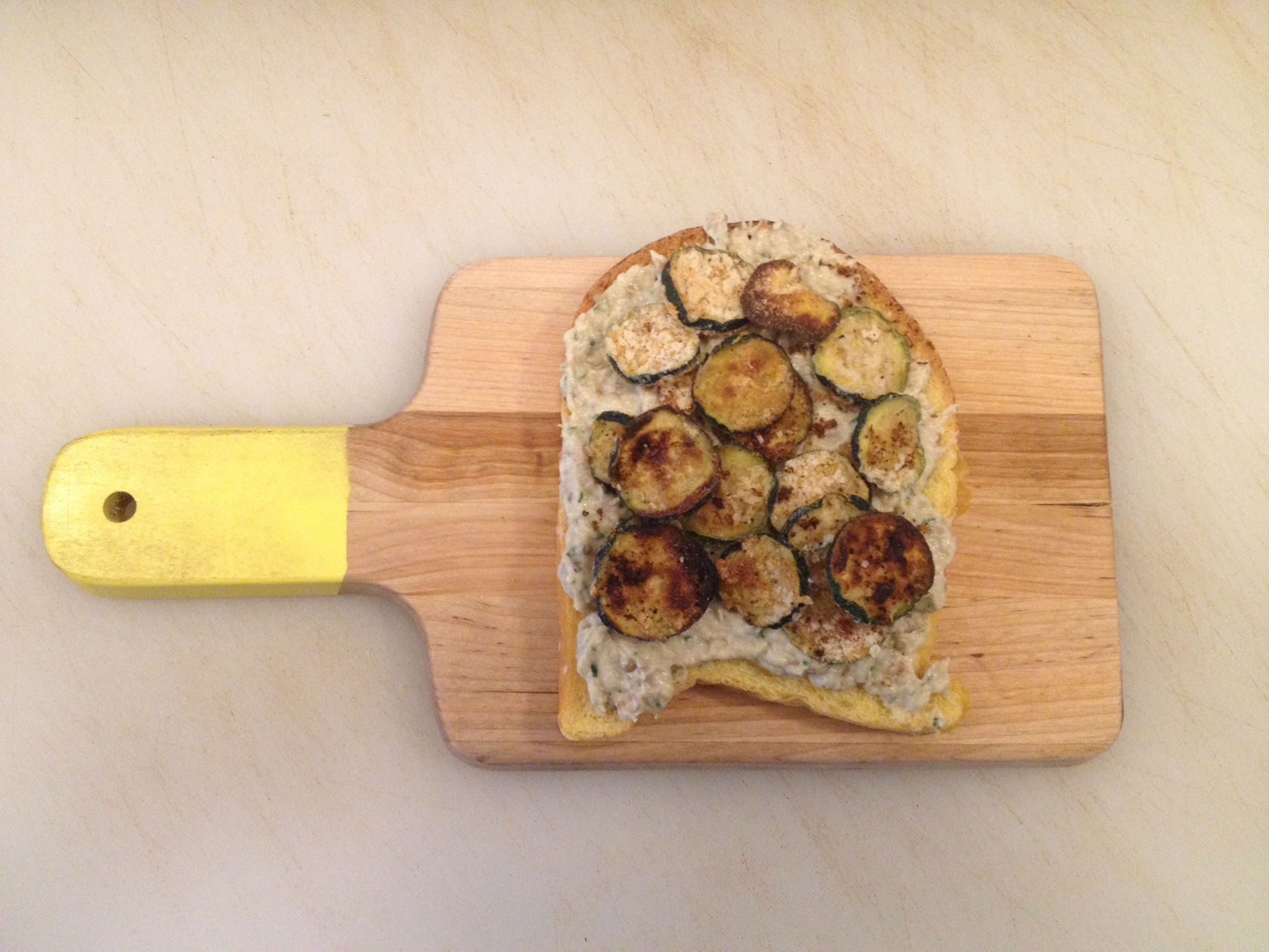 - Take one piece, generously spread baba ganoush on unbuttered side, add 4 pieces of crispy zucchini, add grated white cheddar and close sandwich with other piece of challah, buttered side on the outside.