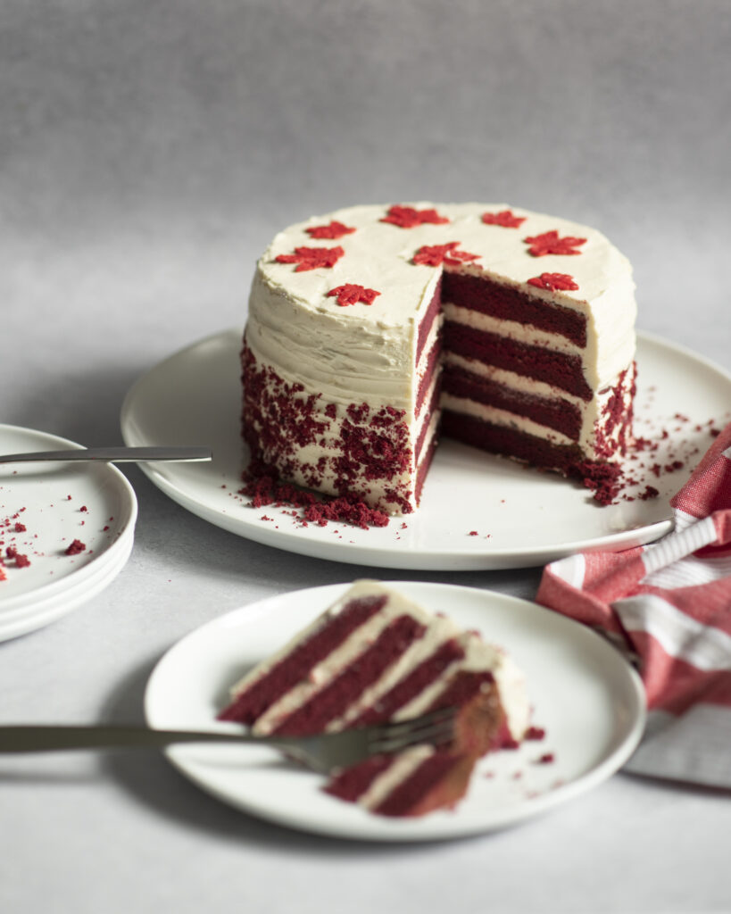 This is a classic red velvet cake recipe, but especially perfect for Canada Day if you want to add any special designs or decorations! We hope you enjoy this recipe!