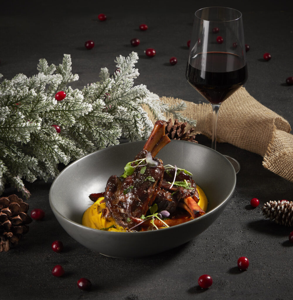 3. Pour the mashed potatoes into the Beyond Side Plate and place the lamb shanks on top. Garnish them with radish sprouts.