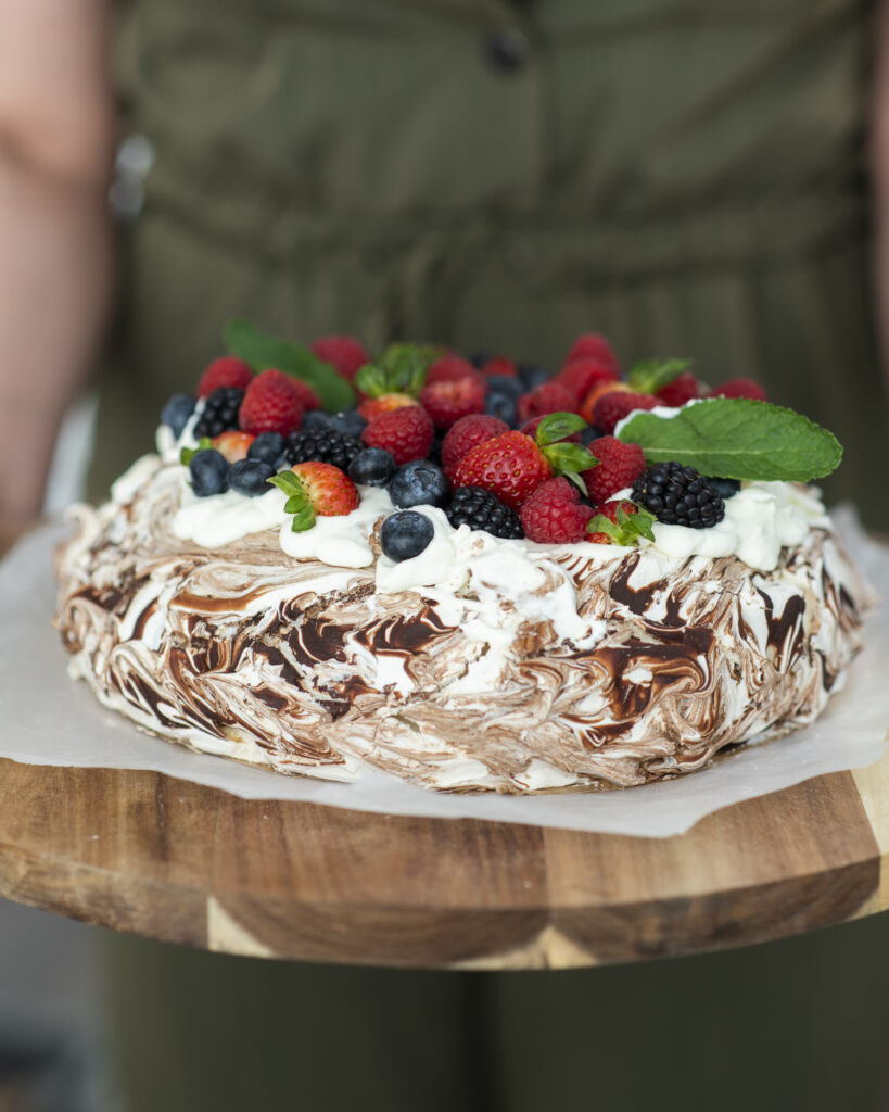 Pour the cooled, melted chocolate evenly over the mixture and fold through carefully only once. The chocolate will swirl more as you shape the pavlova.