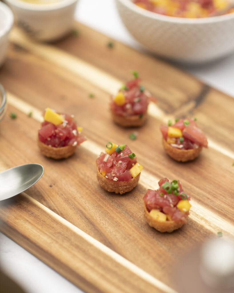 Start by slicing up your tuna into very small cubes. Once it’s sliced, add it into a bowl with wasabi paste, soy sauce, tamarind sauce, sesame oil oyster sauce, and thinly sliced shallots and manges and finish with sesame seeds and chives. Mix until it’s all incorporated.