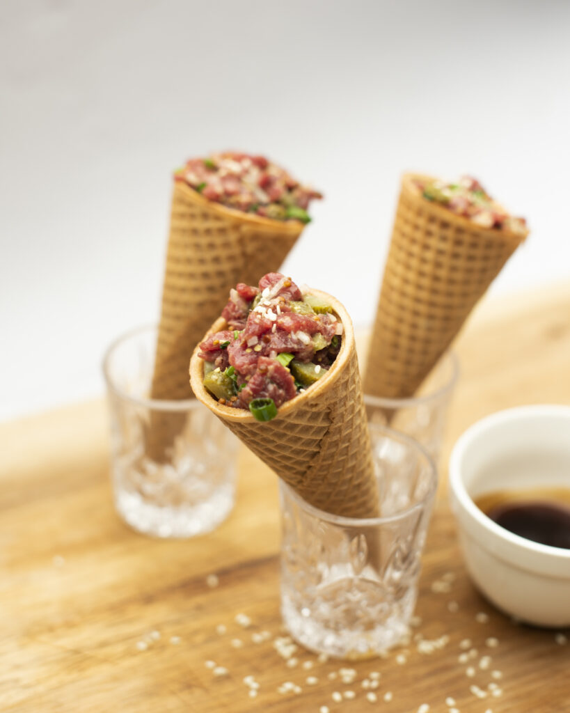 Once you’ve sliced your beef in a fine cubes, add it to a mixing bowl where you add your chopped shallots, cornichons, parsley, worchestire sauce and mustards. Mix together until well incorporated. We scooped these into mini waffle cones for a unique style of serving them – but this recipe also works perfectly alongside fries or baguette.