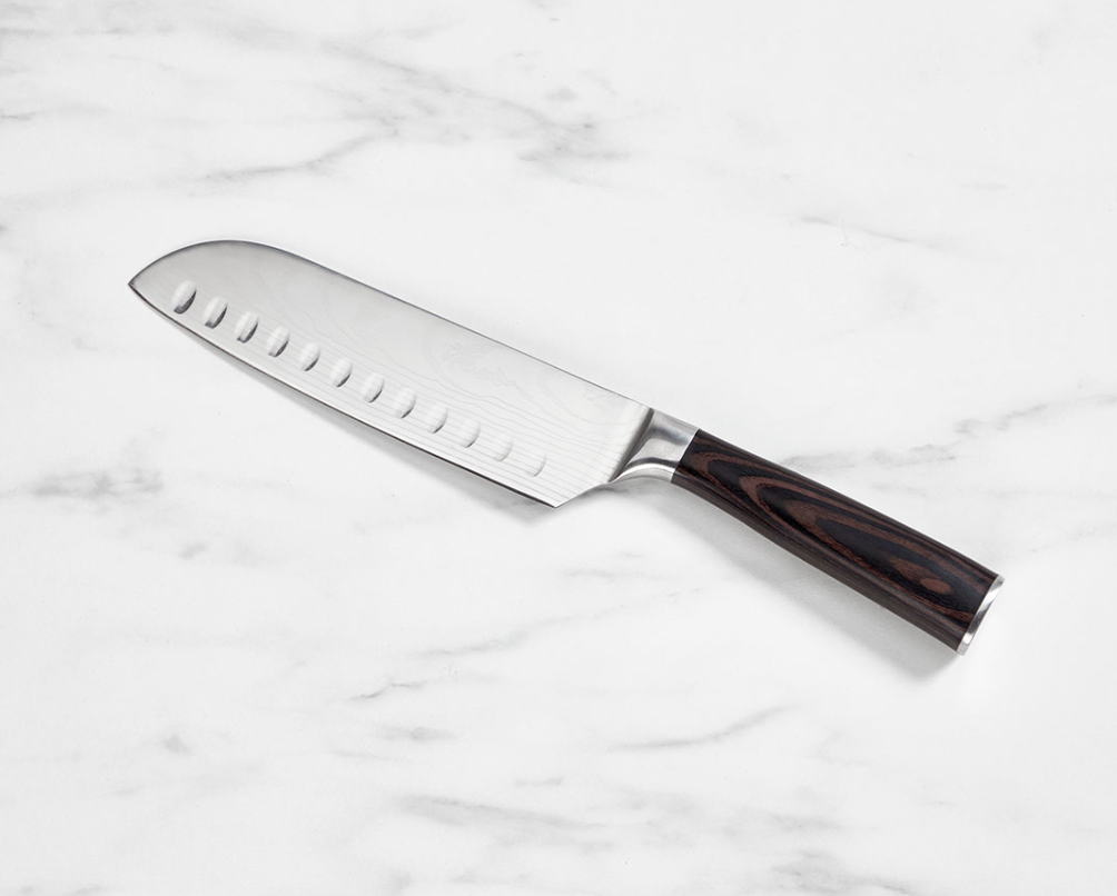 The Santoku knife is a versatile Japanese blade designed for precision slicing, dicing, and chopping. With its straight edge and distinctive blade, it excels in cutting vegetables, fruits, and boneless meats. The hollow-ground indentations along the blade help prevent food from sticking, making it ideal for smooth, efficient cuts.