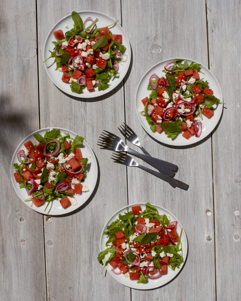 In a large bowl combine your salad, cubed watermelon, red onion, feta, and mint. Stir until ingredients are well combined. Drizzle lightly with balsamic vinegar or glaze, if using. Serve chilled.